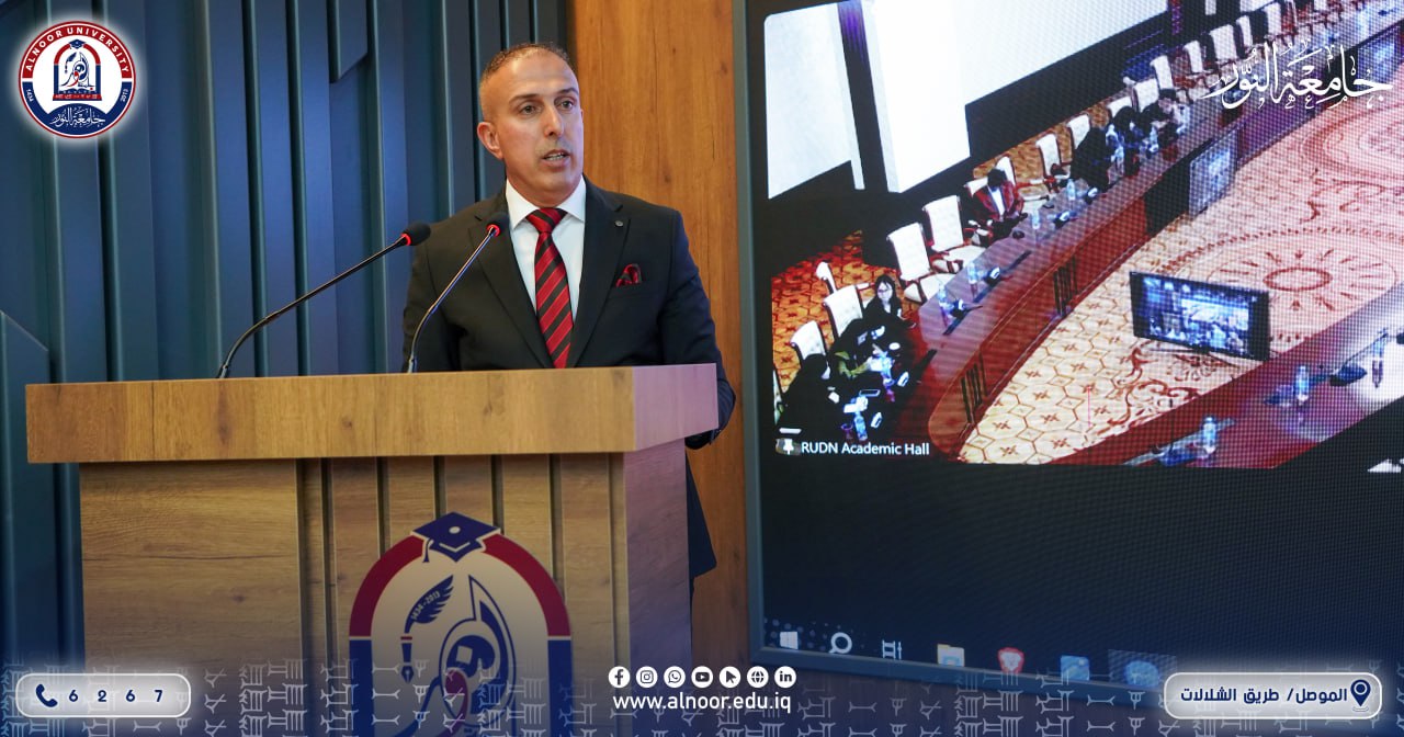 Under the patronage of His Excellency Dr. Naim Al-Aboudi, Minister of Higher Education and Scientific Research, and in the presence of Prof. Dr. Yaseen Taha Al-Hajjar, The Second International Scientific Conference on Media was organized by Al-Noor University and the University of Mosul on the morning of Wednesday, September 10, 2025, under the title: “Digital Media Facing Change… Challenges of the Present and Prospects for the Future.” The opening session began with speeches delivered by Prof. Dr. Yaseen Taha Al-Hajjar, President of Al-Noor University; Prof. Barabash Viktor, Dean of the Faculty of Philology at Rodn University in Russia; Prof. Dr. Hatem Fahd Al-Taie, Dean of the College of Arts at the University of Mosul; and the Dean of… College of Arts at Alnoor University, Prof. Dr. Wael Al-Nahhas . In addition, two videos were presented, one from Alnoor University and the other from Rodn University in Russia.